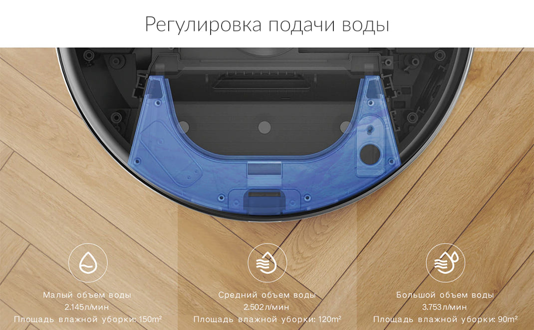 Чтобы отправить Xiaomi Lydsto R1 Robot Vacuum Cleaner вытирать полы, достаточно наполнить бак водой и установить специальное крепление. В контейнер встроен электронасос, поэтому в мобильном приложении доступна регулировка интенсивности смачивания. Можно выбрать одну из трех позиций: низкая обильность подачи воды (бака хватает на 150 кв. м.), средняя (120 кв. м.) и высокая (90 кв. м.).