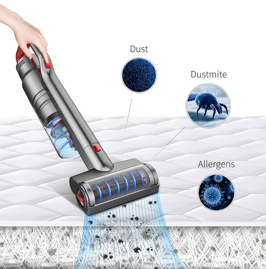 Беспроводной пылесос оснащен мощным двигателем 500 Вт, скорость работы которого достигает 100000 об/мин. Циклонная система фильтрации осуществляет отделение загрязнений от воздуха с эффективностью 99,97 %. Настенное крепление выступает в качестве зарядной станции, поэтому прибор удобно хранить. Время автономной работы составляет 70 минут.