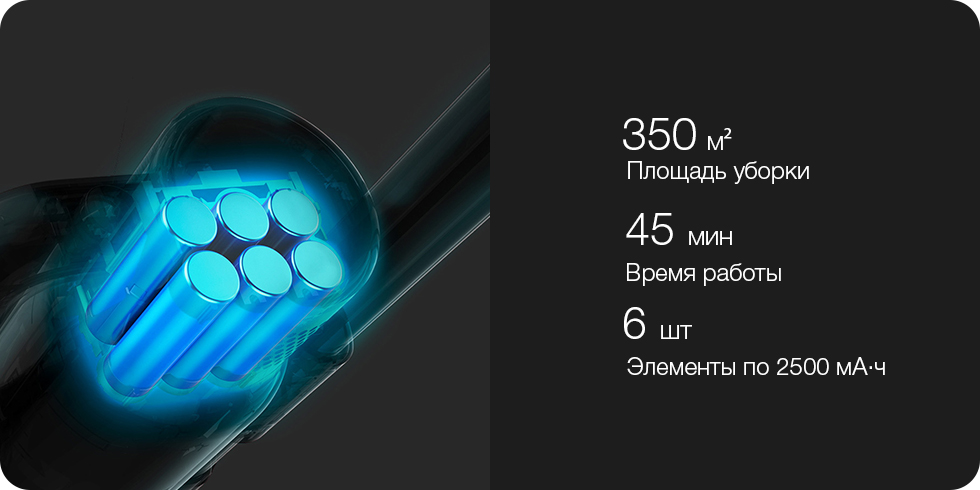 6 литиевых аккумуляторных элементов ёмкостью по 2500 мА·ч обеспечивают общую ёмкость в 54 Вт·ч. В стандартном режиме полного заряда хватит на 45 минут работы, то есть всего от одной зарядки можно убрать целых 350 м² площади.