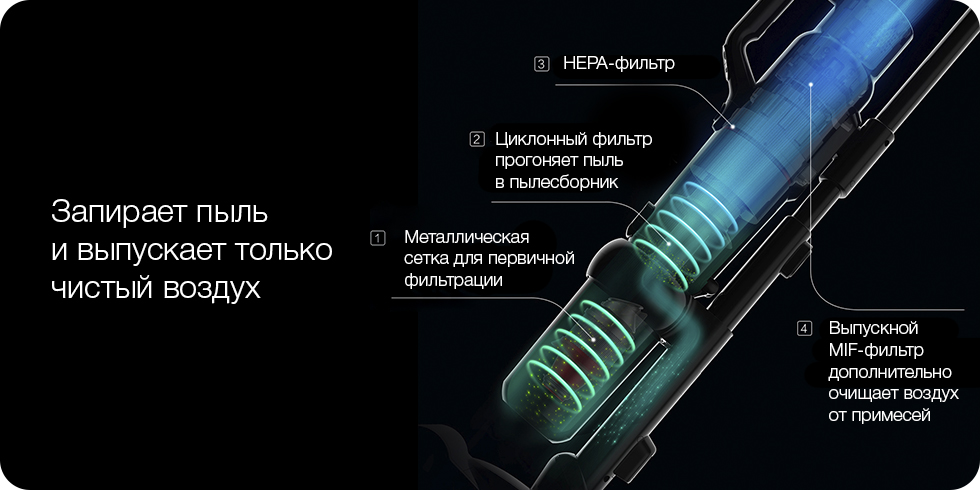 Для наилучшей фильтрации поступающего воздуха в пылесосе Jimmy воплощена технология трехступенчатой циклонной фильтрации, которая эффективно улавливает содержащиеся в воздухе пыль и частицы, предотвращая образование пробок и поддерживая высокую мощность всасывания. Особые фильтрующие материалы улавливают частицы пыли и аллергенов размером до 0.3 мкм, чтобы из пылесоса выходил только чистый воздух.