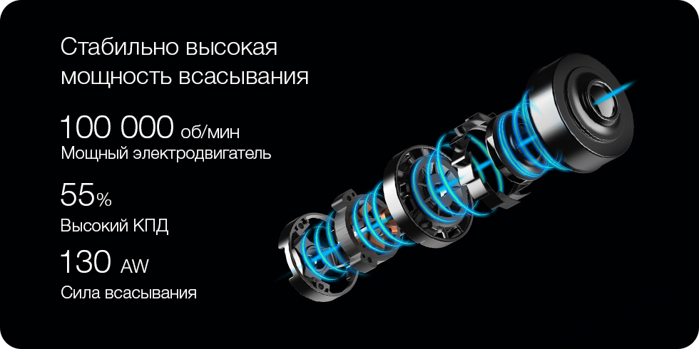 Новое поколение бесщеточных электродвигателей Jimmy, работающих на скорости 100'000 об/мин, обеспечивает непревзойденную силу всасывания в 130 AW, что позволяет высасывать пыль из щелей пола или из глубины ковра. При высоком КПД в 55% расход энергии ниже, чем у пылесосов той же мощности, а время работы - намного дольше.